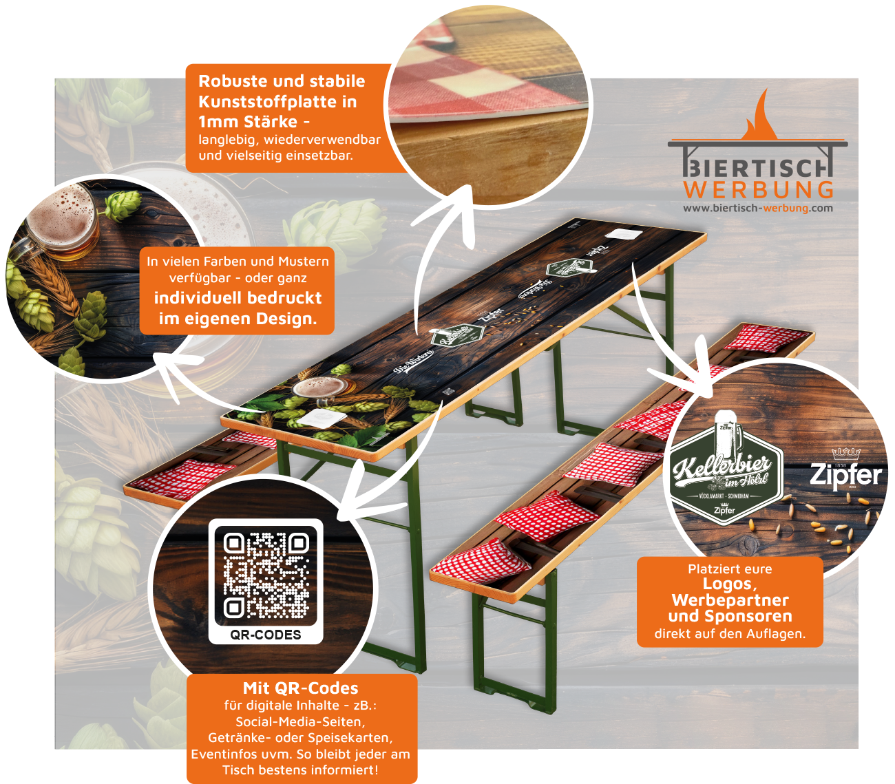 Verwandelt einfache Biertische, Bierbänke und Stehtische in echte Hingucker - mit individuell bedruckten Biertischauflagen von BIERTISCH-WERBUNG.com